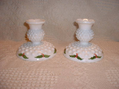 FENTON "HOLLY on MILK GLASS pr of CANDLE STICKS 1971-74