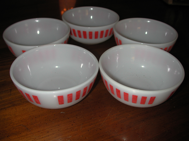 5 Hazel Atlas Milk Glass Candy Red Stripe Bowls