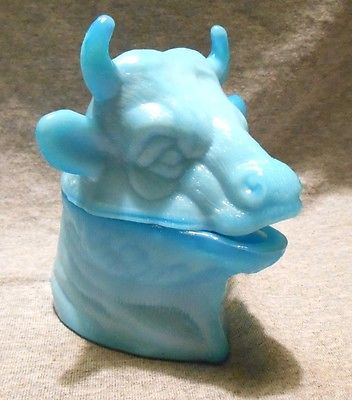 Title (ebay affiliate link): BLUE MILK GLASS FERDINAND THE BULL HEAD MUSTARD OR CONDIMENT COVERED JAR COW