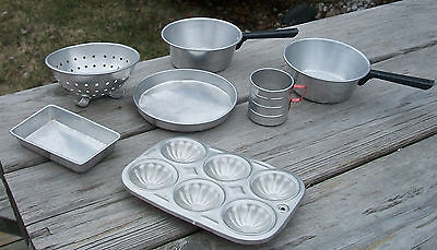 7 Vtg Aluminum Child Size Kitchen Toys Colander Strainer Measuring Cup More Lot