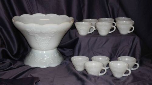 Title (ebay affiliate link): Anchor Hocking White Milk Glass Grape Harvest Punch Bowl 11 Cup Serving Ware