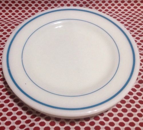 3 Pyrex Restaurant Ware Plate Blue Striped Rim White Milk Glass Dinner Vintage