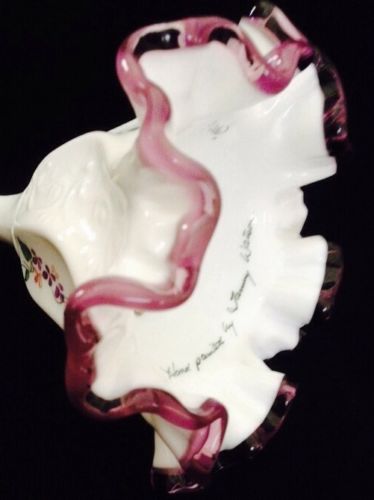 Title (ebay affiliate link): Fenton White Milk Glass Signed/Numbered 40th Bell Purple Crest Ruffle w/ Label