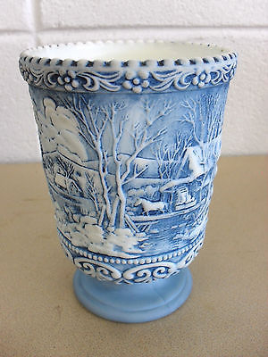 Vintage FENTON Art Glass Currier & Ives Spooner Vase Bluewash/Milkglass Signed