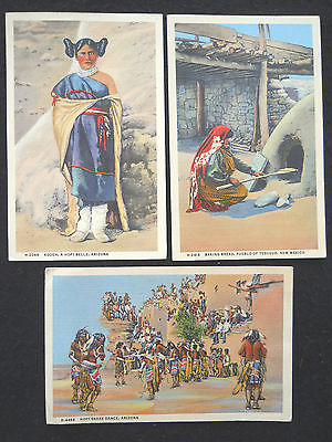 3 Vintage Fred Harvey Linen Postcards /1945 WWII Navy / Pueblo & Hopi Indian