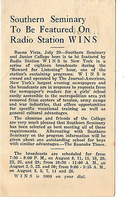 SOUTHERN SEMINARY AD CARD 1942 / BUENA VISTA, VA / VIRGINIA