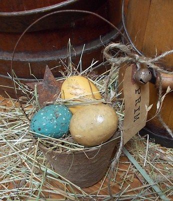 Title (ebay affiliate link): Primitive Spring Easter 3 Eggs Pail Natural Grass Rusty Star 7 in Tall