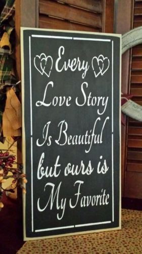 Title (ebay affiliate link): Primitive Country Shelf Sitter Sign "Every Love Story Is Beautiful......... "