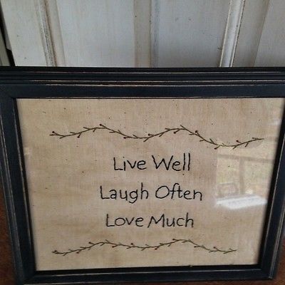 Title (ebay affiliate link): Primitive Colonial Wholesale Framed Stitchery Live Well, Laugh Often, Love Much