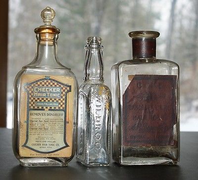 Title (ebay affiliate link): ANTIQUE THREE PIECE HAIR TONIC BOTTLE LOT - CHECKER - COKE - WILDROOT