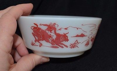 Vintage HAZEL ATLAS MILK GLASS CEREAL BOWL red cowboys western bull campfire