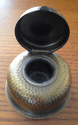 Title (ebay affiliate link): CIRCA 1920 ARTS & CRAFTS HAMMERED BRASS INKWELL WITH ORIGINAL GLASS INSERT