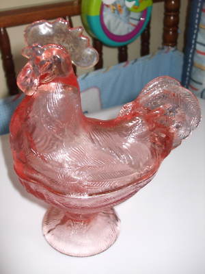 Title (ebay affiliate link): Larger Rooster Candy Dish ( pink depression glass )