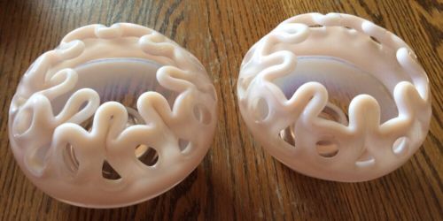 Title (ebay affiliate link): Vintage Pair of Pink Glass Handblown Candle Holders W/ Milk Glass Ribbon Edge