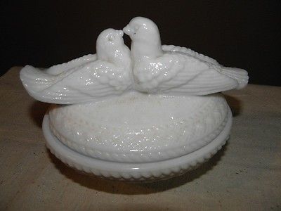 Title (ebay affiliate link): Doves on Nest Candy Bowl w/ Lid Milk Glass White Westmoreland