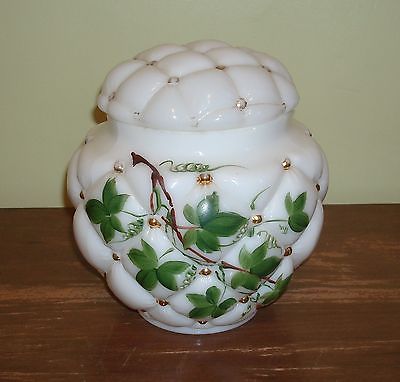 Vintage Phoenix Consolidated Milk Glass Quilted Biscuit Jar Painted Green Ivy