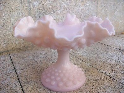 Title (ebay affiliate link): Fenton Pink Milk Glass Hobnail Ruffled Top Candy Dish Compote