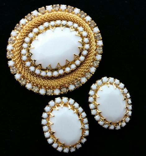 Title (ebay affiliate link): Vintage JULIANA SET Brooch Pin Clip Earrings Milk Glass Rhinestone Pretty! 1410