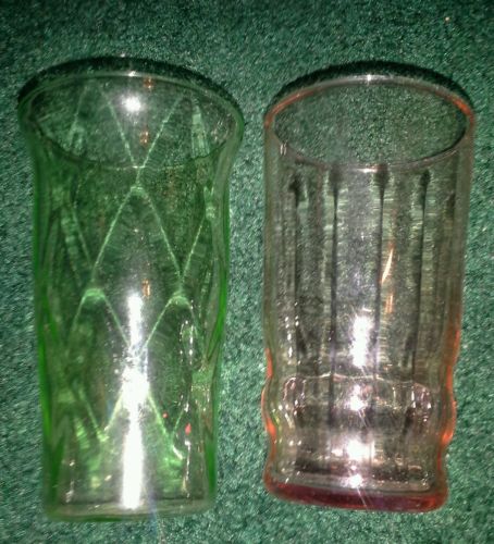 Title (ebay affiliate link): 2 Vintage Pink/Green Depression glass juice, water glasses tumblers