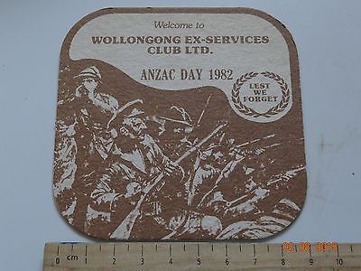 1 x OLD RETRO 1982 ANZAC DAY WOLLONGONG EX-SERVICES CLUB BEER COASTER/MAT..