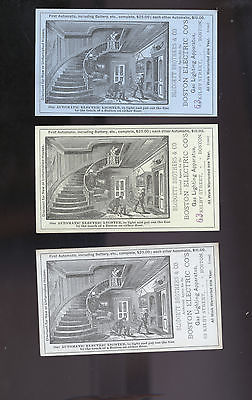 6 1800's Boston Electric Co. trade cards,Blodgett Bros..ads for lighting
