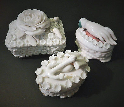 Title (ebay affiliate link): 3 Antique Porcelain Fairing Trinket Boxes Box Lot Anchor/ Hand/ Rose