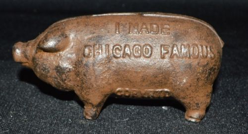 1902 CAST IRON PIG: I Made Chicago Famous Piggy BANK
