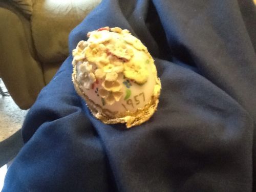 Title (ebay affiliate link): ANTIQUE EASTER HAND BLOWN & PAINTED WHITE MILK GLASS EGG FLORAL DECORATION 1957