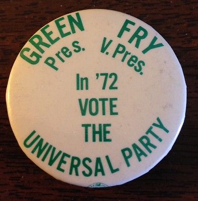Title (ebay affiliate link): 1972 Universal Party Green/Prez and Fry/VP Pinback Button