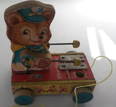 Vintage Fisher Price Tiny Teddy 635 Wood Wheels