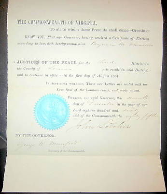 Title (ebay affiliate link): 1860 Signed Election Certificate Louisa VA by Governor John Letcher Justice