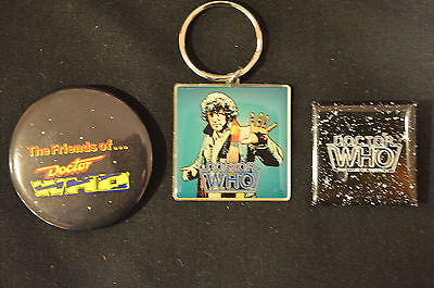 Title (ebay affiliate link): 2 VINTAGE 1980's Dr. WHO Pins - including Fan Club MOOD Pin + Keychain