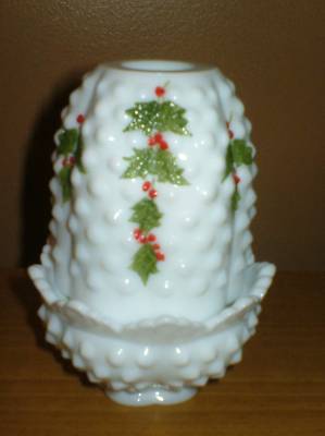 Fenton Milk Glass Hobnail Christmas Holly Fairy Lamp
