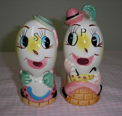 Title (ebay affiliate link): 1958 ENESCO HUMPTY DUMPTY ANTHROPOMORPHIC 4 7/8" PASTEL SALT & PEPPER SHAKERS