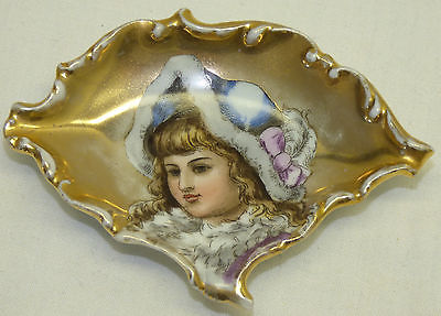 Antique Gold Porcelain Trinket Pin Dish Victorian Girl Doll w/ Fur Bonnet Hat