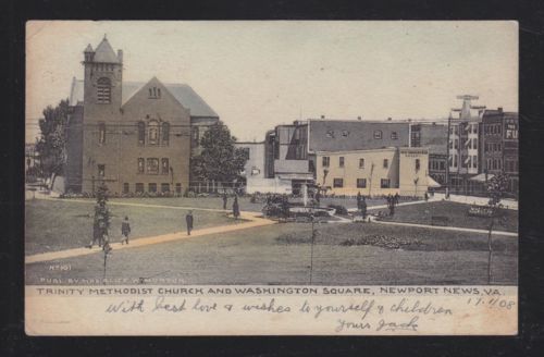 USA 1908 METHODIST CHURCH & WASHINGTON SQUARE IN NEWPORT NEWS VIRGINIA POSTCARD