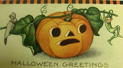 Title (ebay affiliate link): VINTAGE EMB WHITNEY HALLOWEEN~JOL~ GHOST SKELETON & GREEN PIXIE ON PUMPKIN VINE