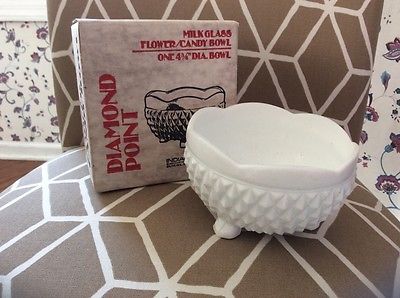 vtg Indiana Glass /Milk Glass Footed Bowl Diamond Point Pattern Scalloped Top