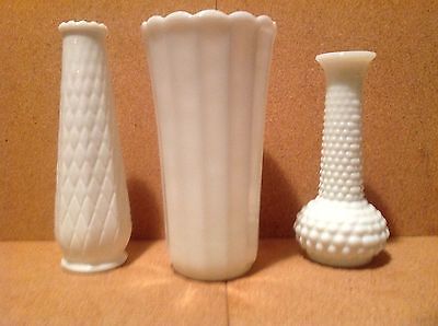 3 Vintage White Milk Glass Flower Vases