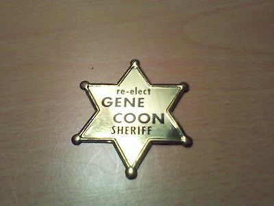 Title (ebay affiliate link): RE-ELECT GENE COON SHERIFF TIN BADGE Allegheny County, Pennsylvania