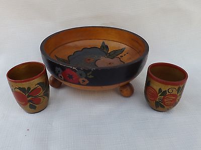 Vintage Painted Colorful Wood Snack Bowl with Two Snack Cups Footed Flowers