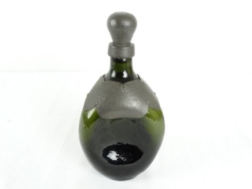 Title (ebay affiliate link): Antique Fra Gudrun Fil Far Pewter green Glass Alcohol Bottle Origin Unknown