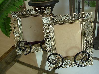 PICTURE FRAME Gold Tone Whitewash Metal Fancy Filigree 3 1/2 x 4 1/4 Set of Two