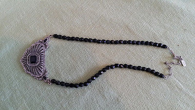 Title (ebay affiliate link): Marked 1928 black milk glass or (onyx?) 7" hooked choker w/silver tone pendant