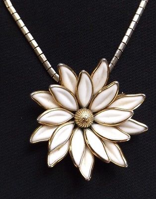 Title (ebay affiliate link): Vintage Crown Trifari White Milk Glass Flower 2" Pendant Necklace On 14" Chain