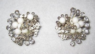 VINTAGE HASKELL SIGNED MILK GLASS AND RHINESTONE EARRINGS~LOVELY CLIP ON