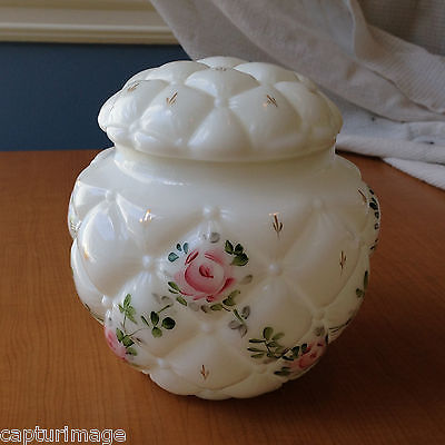 Milk Glass Cookie Biscuit Bonbon Lidded Jar with Hand-painted Flowers and Gold