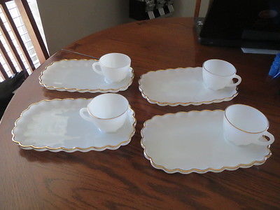 Title (ebay affiliate link): Fire King White Milk Glass 22K Gold Trimmed Classic 8 Piece Snack Set
