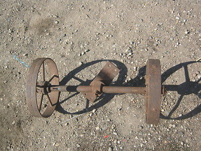 Title (ebay affiliate link): 2 Antique Industrial Freight Cart / Farm Wheels & Axle ~ Vintage Hit Miss Wagon