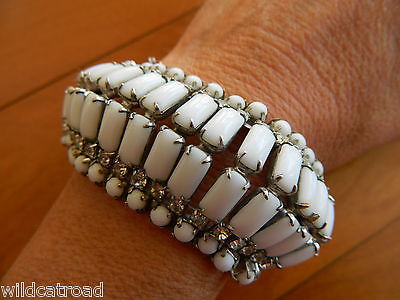 VINTAGE UNSIGNED WEISS MILK GLASS RHINESTONE WIDE HUMPBACK BRACELET & EARRINGS